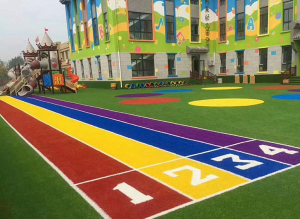 2、幼兒園的人造草坪美觀多姿多彩,在鋪路過程中,可以將不同顏色的草坪拼接成不同的圖案,有效地提高了幼兒園兒童的思維能力。